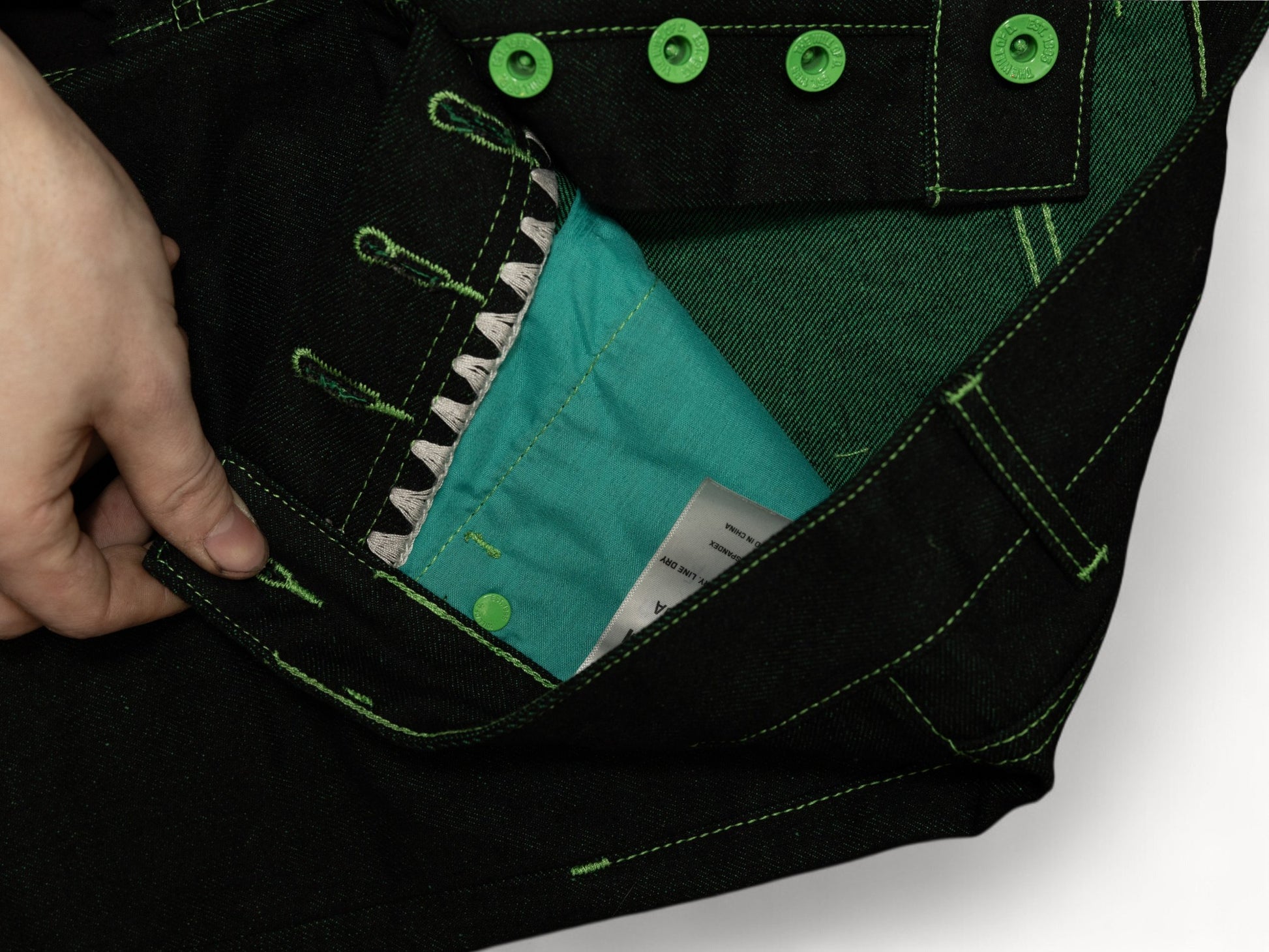 15oz indigo stretch denim (62% cotton / 36% poly / 2% elastane)